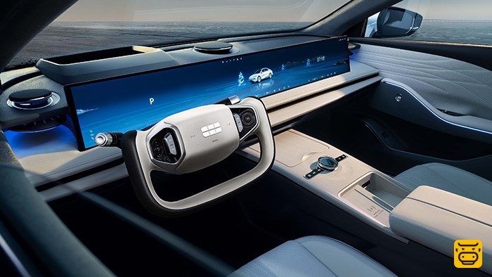 来到车内,最引人注目的就是这块45英寸8K显示屏,从驾驶位左侧一直延续到副驾右侧,几乎贯穿了整个中控台。大屏还采用了超薄设计,厚度为9.8毫米。据悉,新车将率先搭载高通骁龙8295旗舰级芯片与吉利全新的车机系统。